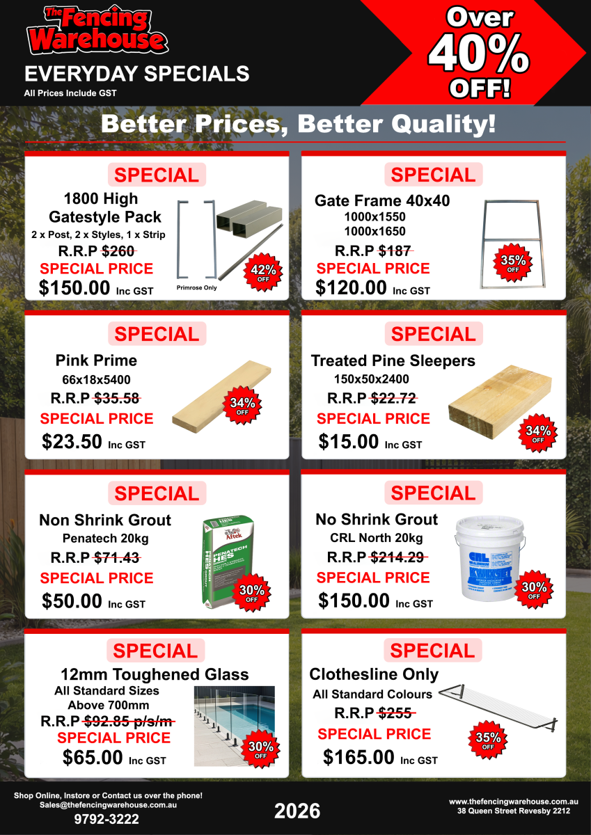 At The Fencing Warehouse, we believe in looking after our customers with honest pricing, dependable stock, and real value on the products you use most. Whether you’re a contractor, tradie, or tackling your own project, our Everyday Specials are our way of helping you get the job done while keeping costs under control.