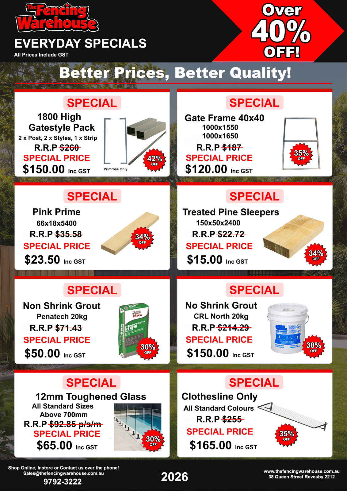 At The Fencing Warehouse, we believe in looking after our customers with honest pricing, dependable stock, and real value on the products you use most. Whether you’re a contractor, tradie, or tackling your own project, our Everyday Specials are our way of helping you get the job done while keeping costs under control.